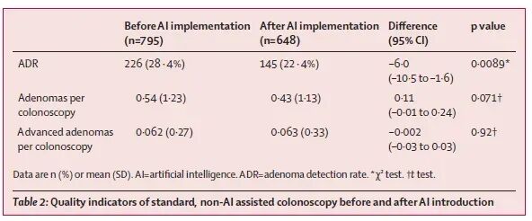 主要终点:AI引入前后标准镜ADR差异;次要终点:人均腺瘤数(APC)、人均进展期腺瘤数及镜师个体ADR变化。采集患者年龄性别、镇静、波士顿肠道准备评分、插管完整性、镜师专业与年限等混杂变量,采用混合效应logistic回归校正,并做中心、性别、年龄分层。