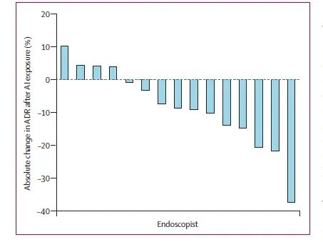 本研究首次以真实世界数据证实,持续依赖CADe系统3个月即可显著降低内镜医师裸眼检出腺瘤的能力,且女性医师、女性患者及高基线质量中心风险更甚。该结果不仅解释了为何部分随机试验中AI“锦上添花”效应突出,也为全球快速部署智能内镜的政策敲响警钟:若缺乏“无AI”训练轮换与技能监测,ADR反而可能不升反降。作者呼吁开展随机交叉试验,并探索“可解释AI+认知强制策略”以减轻自动化致钝,为“智能辅助”与人工技艺的平衡提供循证方案。