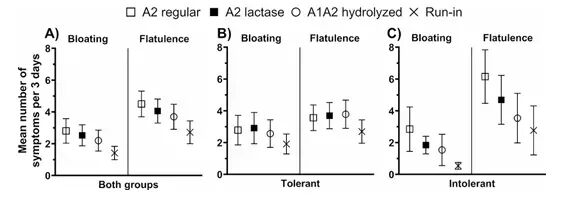 三种干预措施分别为:(1)市售A2牛奶+安慰剂胶囊;(2)同种A2牛奶+乳糖酶补充剂(模拟无乳糖状态);(3)经超滤、纳米滤及酶法水解处理的A1A2牛奶(完全无乳糖且β-酪蛋白减少60%-90%)。每种干预持续3天,中间设有洗脱期。主要评价指标为每日记录的胃肠道症状总评分(包括腹胀、腹痛、排气、排便异常等),次要指标包括粪便钙卫蛋白、血浆高敏C反应蛋白(hs-CRP)及多种炎症细胞因子水平变化。
